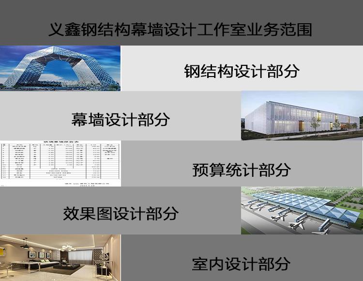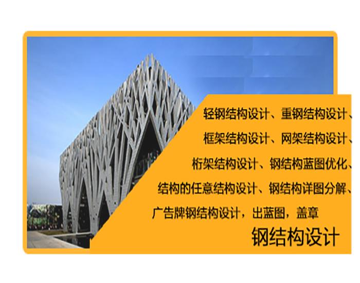 我们与国内多家钢铁设计研究院有着密切的业务往来,主要经营以下业务:钢结构部分:轻钢结构设计、重钢结构设计、框架结构设计、网架结构设计、桁架结构设计、钢结构蓝图优化、钢结构的任意结构设计、钢结构详图分解、广告牌钢结构设计,出蓝图,盖章;幕墙部分:玻璃幕墙设计、石材幕墙设计、铝板幕墙设计、建筑幕墙下料图、建筑幕墙投标方案图;预算部分:建筑预算、钢结构预算、定额预算、报价、广联达套项;效果图部分:建筑效